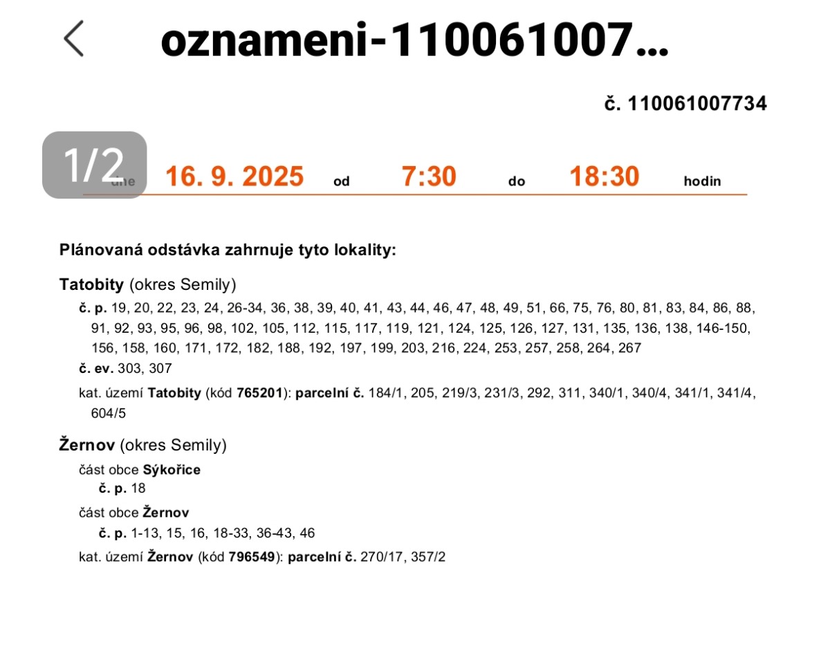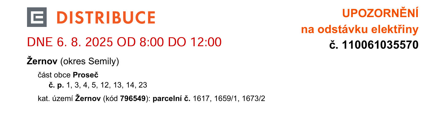 Zasílání oznámení o plánovaných odstávkách e-mailem nebo SMS si můžete sjednat každý ke svému odběrnému místu jednoduše a zdarma na http://www.cezdistribuce.cz/sluzba, popř. jsou tyto informace k dispozici také na http://www.cezdistribuce.cz/odstavky, a to vždy nejpozději 15 dnů před konáním odstávky.